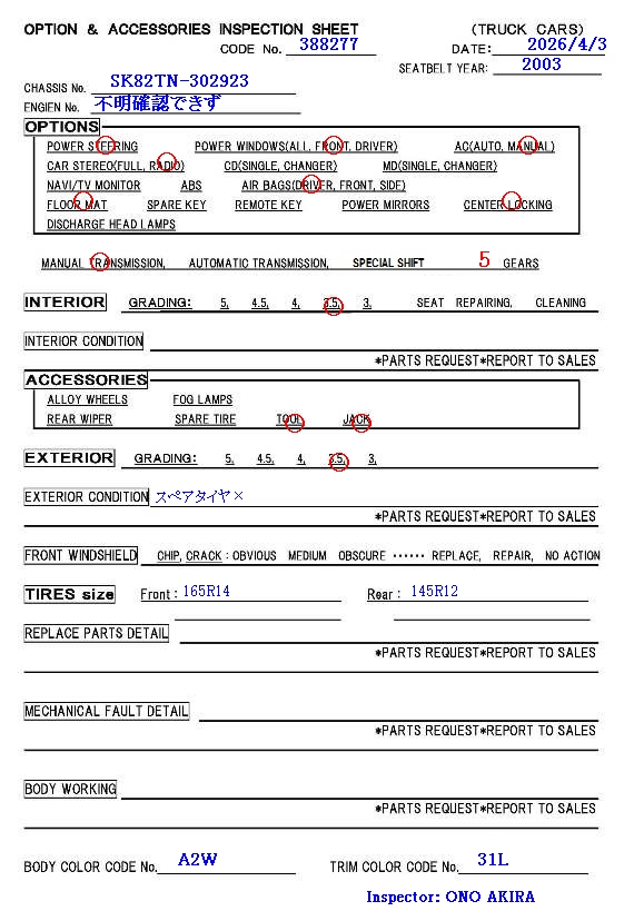 | Engine No: | 不明確認できず |