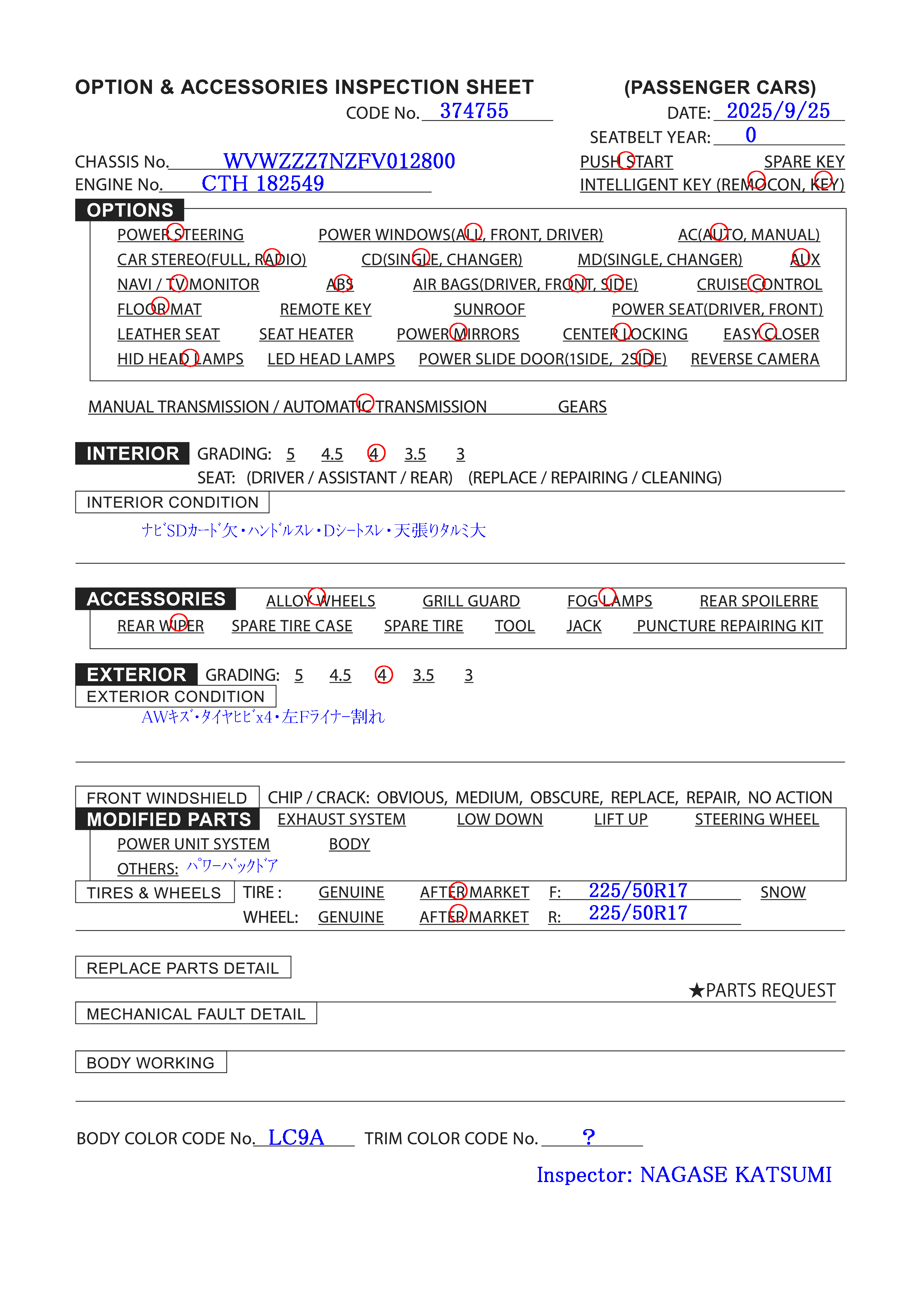 Tire&Wheel Size: F:225/50R17 R:225/50R17