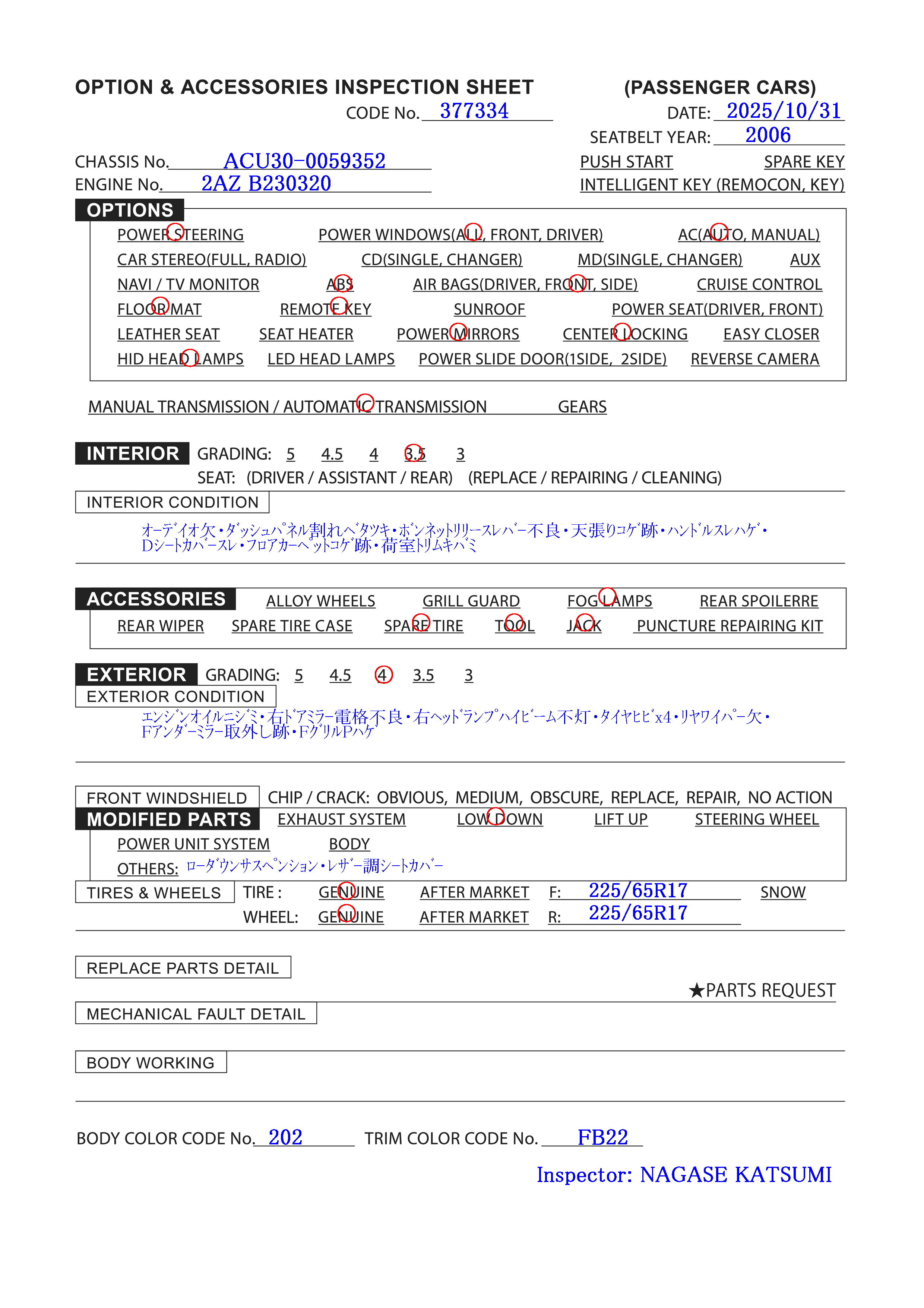 | Tire&Wheel Size: | F:225/65R17 R:225/65R17 |