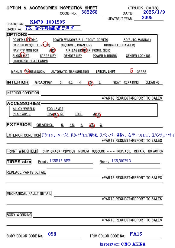 * 5-speed manual transmission * 7K gasoline engine * F & R normal spring suspensions & R leaf spring blades passing above R axle * F & R same size 13 inch tires * Manufactured in 2005/MAY |