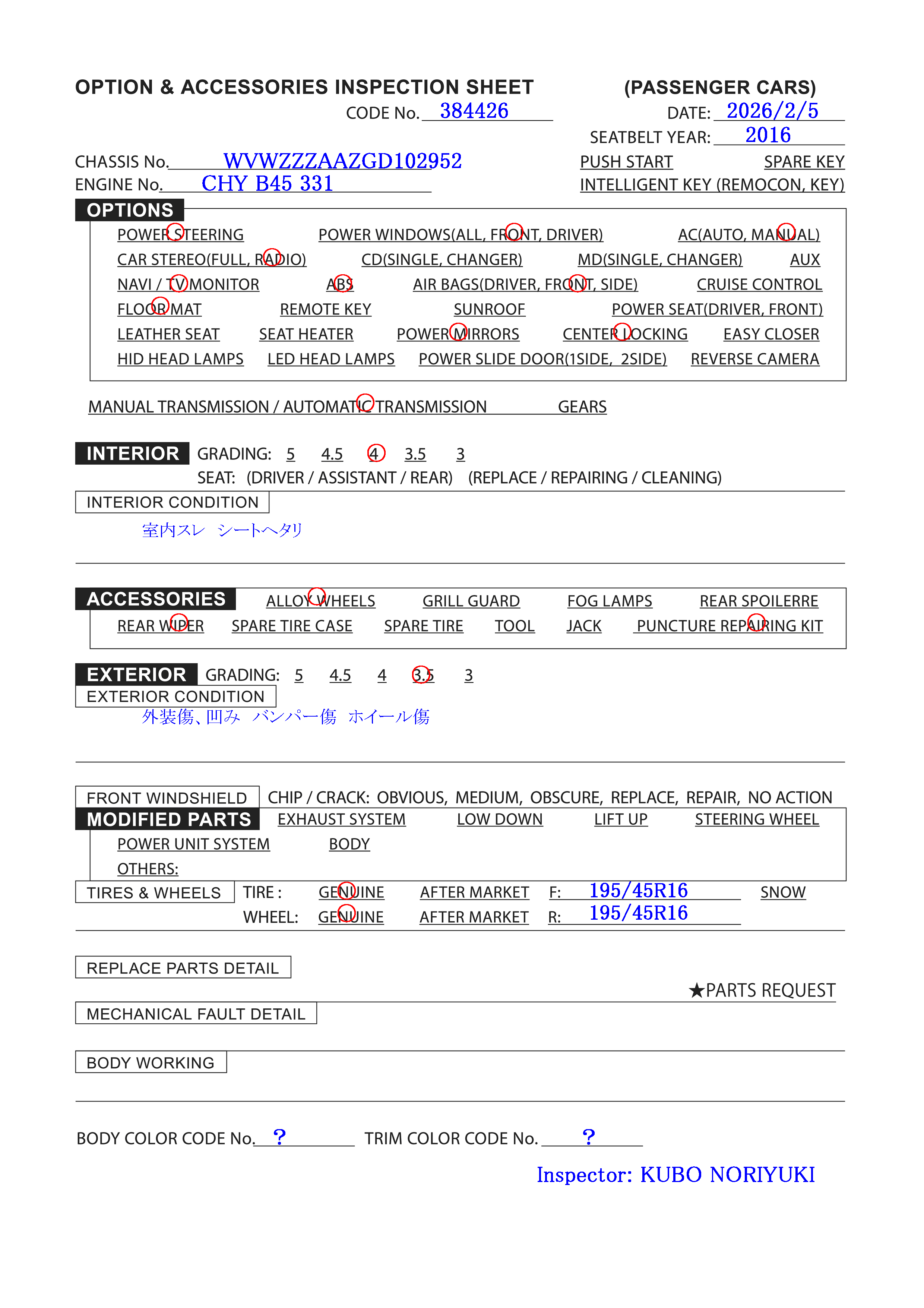 | Pneu &; taille de la roue: | F:195/45R16 R:195/45R16 |