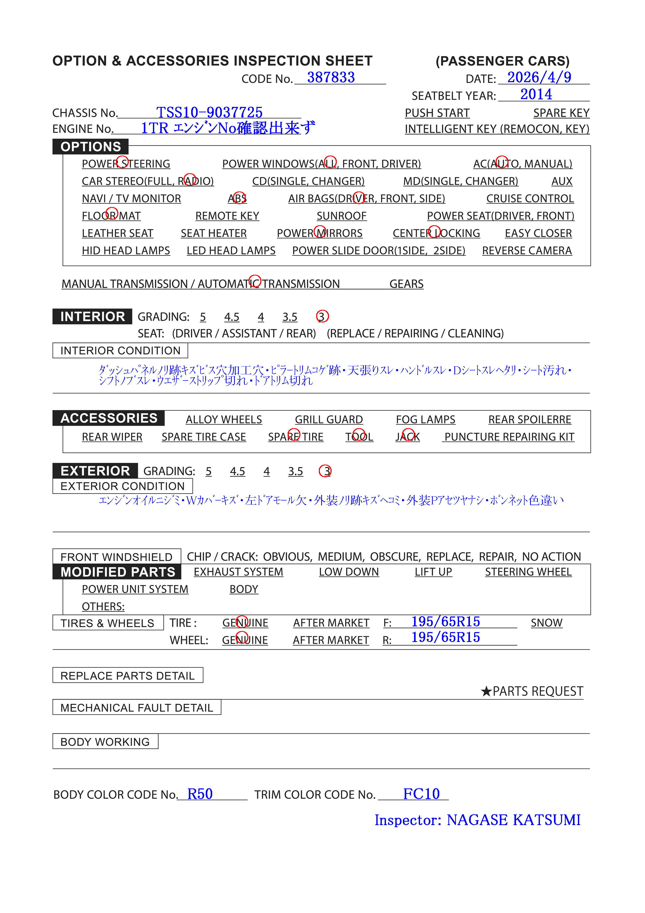| Le NUMÉRO de moteur: | 1TR エンジンNo確認出来ず |