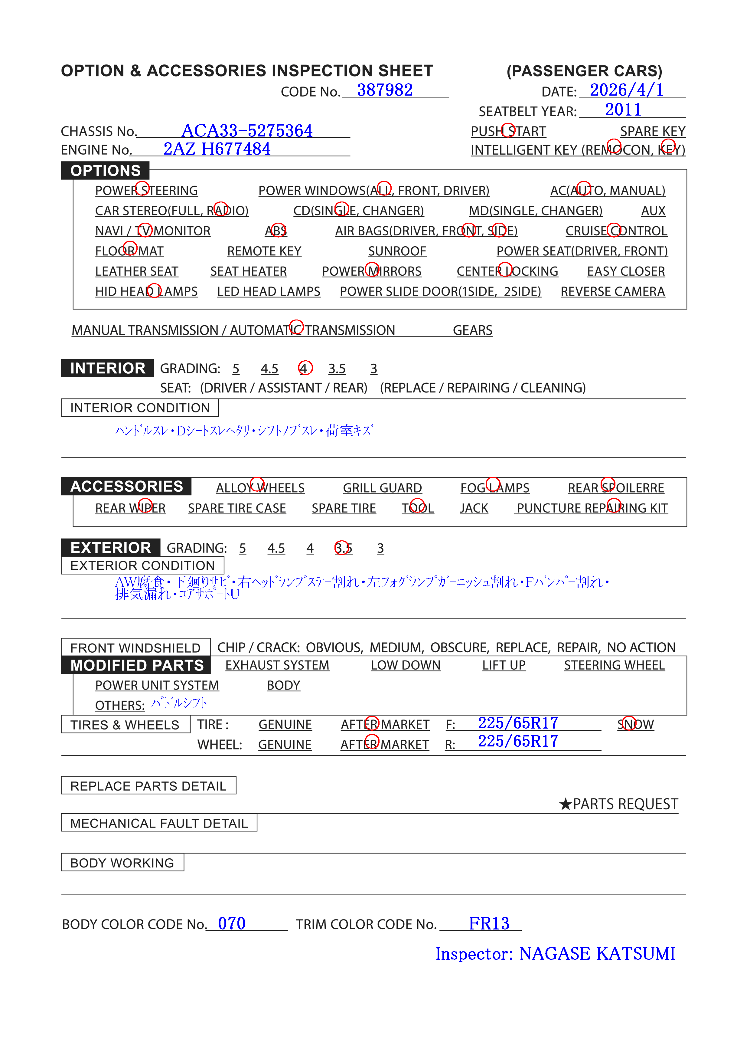 | Размер шин и колес: | F:225/65R17 R:225/65R17 |